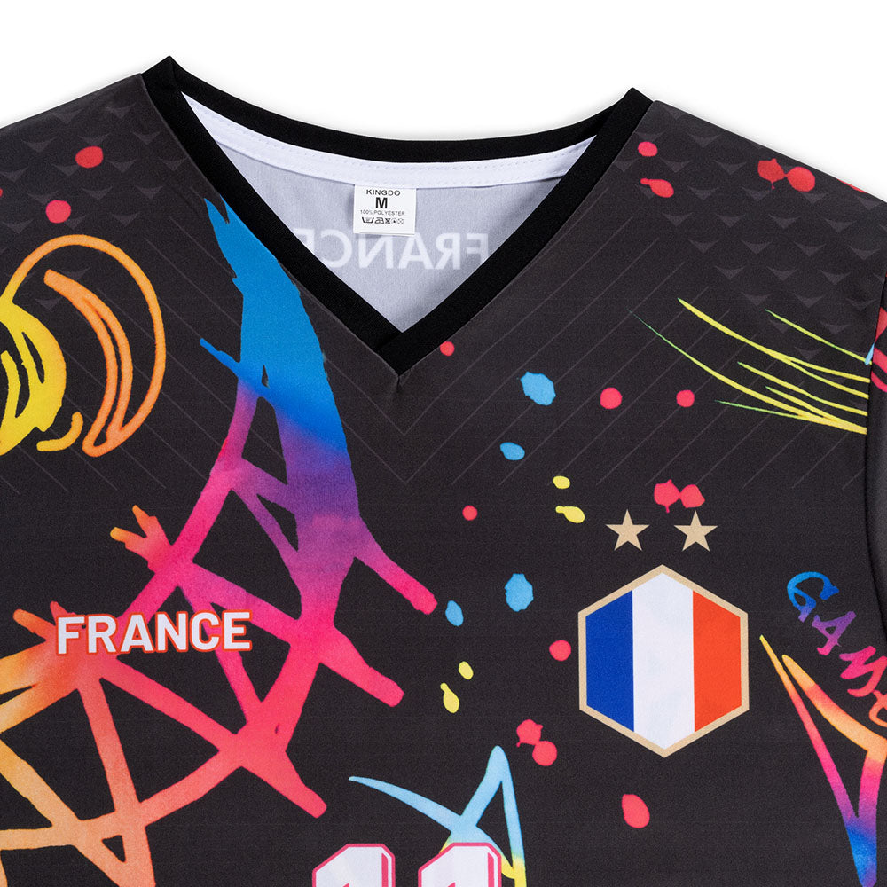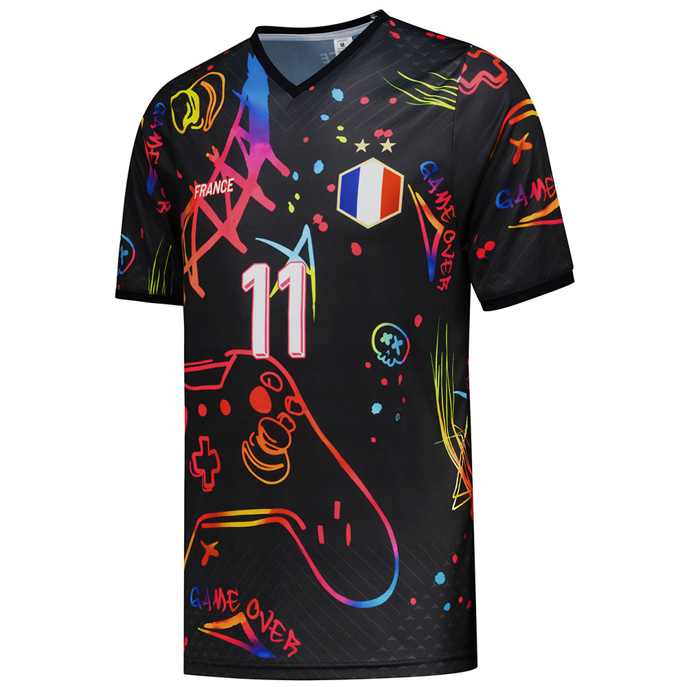 Bringe dein Spiel aufs Feld mit diesem einzigartigen Frankreich Fußballtrikot von Ousmane Dembélé (#11) im farbenfrohen Gaming-Design! Das Trikot und die Shorts sind mit auffälligen Neonprints mit Gamecontrollern, „Game Over“-Details und der französischen Flagge versehen – perfekt für Fußballer und Gamer, die auffallen wollen.