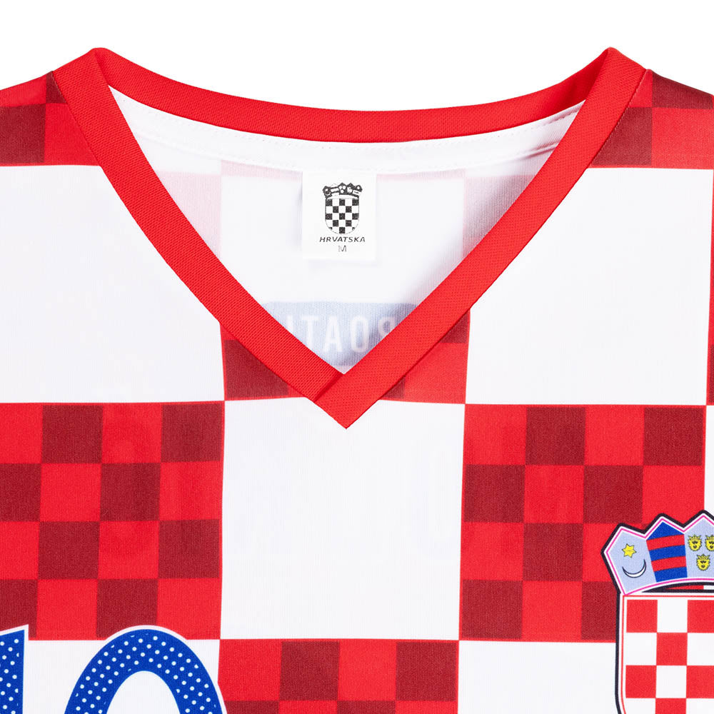Dieses Trikot ist sowohl für Kinder als auch Erwachsene erhältlich und besteht aus einem bequemen Shirt und einer passenden weißen Hose mit dem kroatischen Wappen. Hergestellt aus atmungsaktivem und geschmeidigem Material, das perfekt sitzt beim Fußballspielen oder Jubeln von der Couch aus.