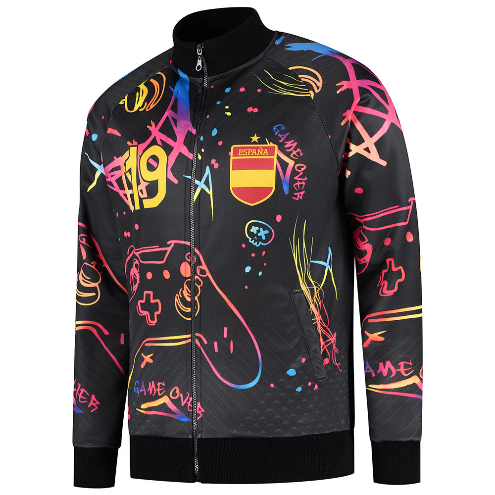 Game on! Dieser einzigartige Spanien Trainingsanzug ist speziell für Kinder, die verrückt nach Fußball und Gaming sind. Bedruckt mit Lamine Yamal 19 und versehen mit bunten Gameprints ist das ein echter Hingucker, mit dem dein Kind auf jeden Fall auffällt.